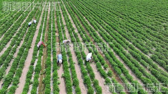 2023年6月19日,和硕县塔哈其镇祖鲁门苏勒村村民在辣椒种植基地除草(无人机拍摄)。