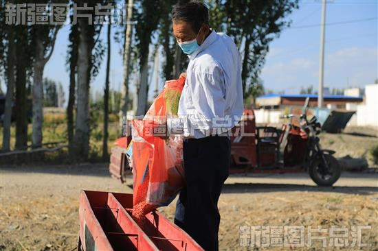 2022年9月26日,博湖县塔温觉肯乡哈尔恩根村村民给播种机添加种子。