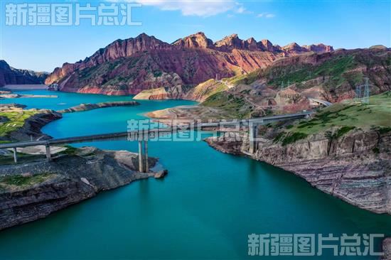 2023年6月16日,呼图壁县南部山区河水碧波荡漾,四周群山环抱,绿草如茵,丹霞地貌与河水相映成景,美如画卷(无人机拍摄)。