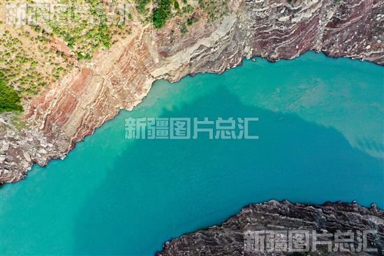 2023年6月16日,呼图壁县南部山区河水碧波荡漾,四周群山环抱,绿草如茵,丹霞地貌与河水相映成景,美如画卷(无人机拍摄)。