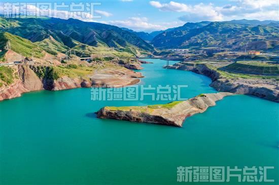 2023年6月16日,呼图壁县南部山区河水碧波荡漾,四周群山环抱,绿草如茵,丹霞地貌与河水相映成景,美如画卷(无人机拍摄)。