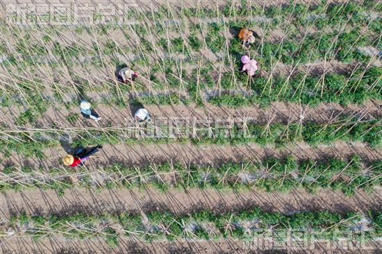 2023年6月13日,昌吉市六工镇东五工村圣女果种植基地,种植户进行打叉、整枝上架作业(无人机拍摄)。