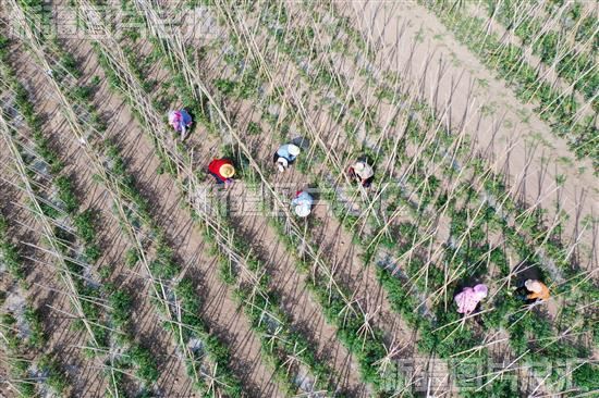 2023年6月13日,昌吉市六工镇东五工村圣女果种植基地,种植户进行打叉、整枝上架作业(无人机拍摄)。