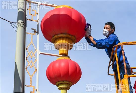 2022年9月28日,乌鲁木齐市天山区城市管理局(行政执法局)公共照明管理所的工作人员在中山路上擦拭灯笼。