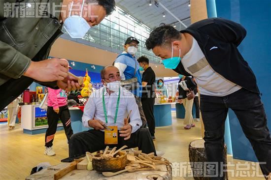2022年9月20日,参展代表在新疆国际会展中心第七届中国—亚欧博览会“丝路古龟兹 神奇阿克苏”主题馆观看柯坪木勺制作技艺。