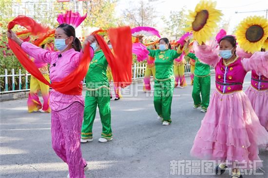 在沙湾市老沙湾镇老沙湾新村,村民们身着艳丽的服装,载歌载舞庆祝丰收节。