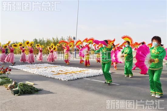 在沙湾市老沙湾镇老沙湾新村,村民们身着艳丽的服装,载歌载舞庆祝丰收节。