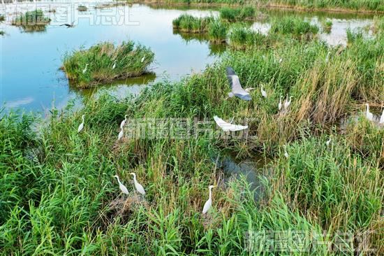 2023年6月24日,白鹭在呼图壁县五工台镇百泉湖湿地栖息(无人机拍摄)。