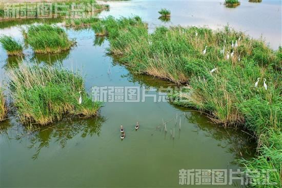 2023年6月24日,白鹭在呼图壁县五工台镇百泉湖湿地栖息(无人机拍摄)。