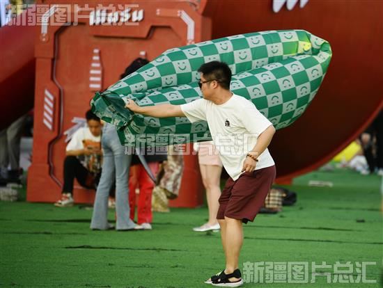 2023年6月23日晚,观众在音乐节现场为自己的简易沙发充气。