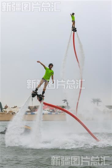 2023年6月22日,在博湖县博斯腾湖大河口景区上演了一场惊险刺激的“水上飞人”特技表演。表演者时而盘旋上升,时而连续空翻,现场一片沸腾。