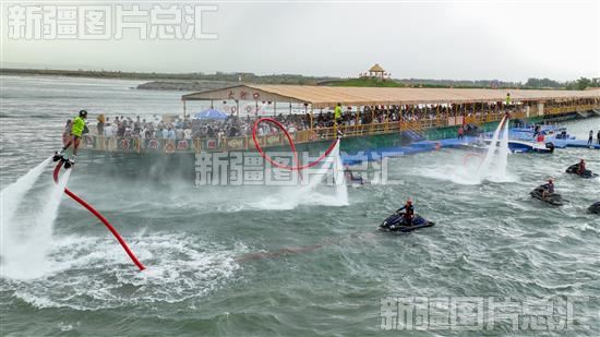 2023年6月22日,在博湖县博斯腾湖大河口景区上演了一场惊险刺激的“水上飞人”特技表演。表演者时而盘旋上升,时而连续空翻,现场一片沸腾。