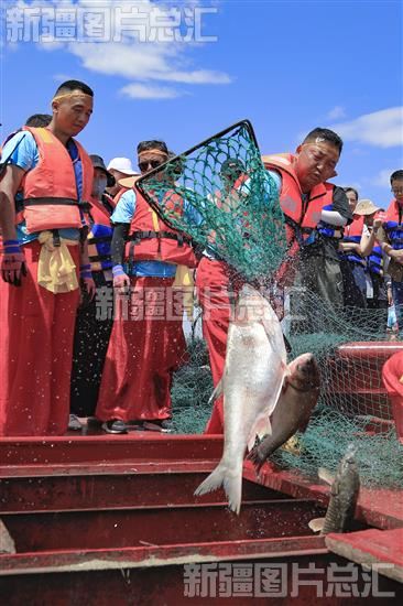 当日,位于博湖县境内的博斯腾湖结束长达100多天的休渔期,迎来开湖季。捕鱼现场一派人欢鱼跃的壮观景象,吸引众多游客齐聚大河口景区,观巨网捕鱼,赏夏日美景,品美味湖鱼。