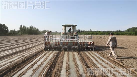 2023年6月20日,阿瓦提县拜什艾日克镇托万克墩博依村村民驾驶机械在田间播种玉米。