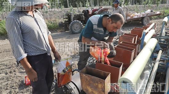 2023年6月20日,阿瓦提县拜什艾日克镇托万克墩博依村村民给播种机添加玉米种子。