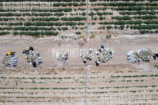 2023年6月23日,库车市墩阔坦镇荷花村村民采收孜然(无人机拍摄)。?