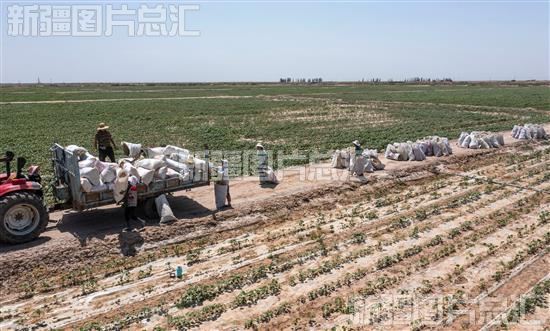 2023年6月25日,库车市墩阔坦镇荷花村村民在地头转运孜然(无人机拍摄)。