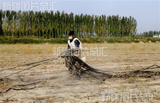 2022年9月20日,新疆生产建设兵团第二师二十二团十连职工在田间回收滴灌带。