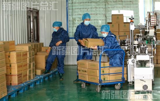 2022年9月14日,位于洛浦县北京工业园区的和田遗宝商贸有限公司员工在食品加工生产车间搬运刚刚生产的农产品。
