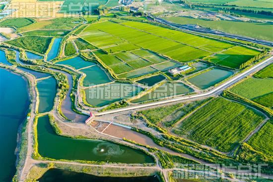 2023年6月30日,呼图壁县园户村镇下三工村连片的鱼塘与四周田园相映成趣,构成一幅优美生态画卷(无人机拍摄)。