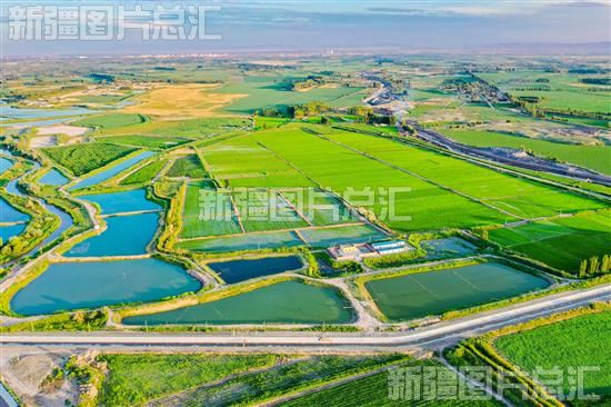 2023年6月30日,呼图壁县园户村镇下三工村连片的鱼塘与四周田园相映成趣,构成一幅优美生态画卷(无人机拍摄)。