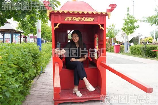 2023年6月28日,游客在额敏县杰勒阿尕什镇杰勒阿尕什村阿山民俗馆前体验坐轿子感受。