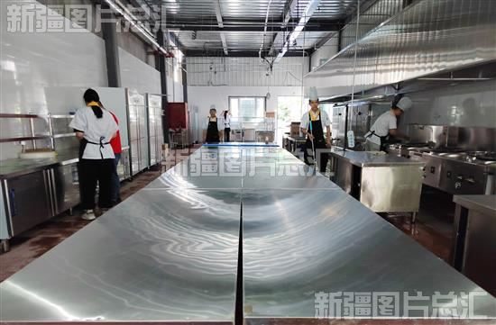 2023年7月3日,新疆首创婚礼堂文化产业园餐饮部工作人员在后厨清扫卫生。