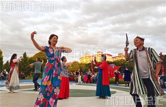 2023年6月28日,在裕民县城镇人民公园广场上,游客和当地各族群众一起跳舞。