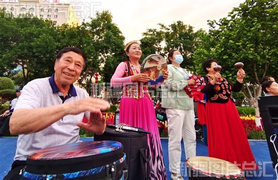 2023年6月28日,在裕民县城镇人民公园广场上,游客和当地各族群众一起跳舞。