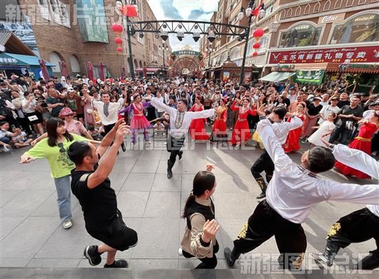 2023年6月28日,游客和演员在新疆国际大巴扎景区互动跳舞。