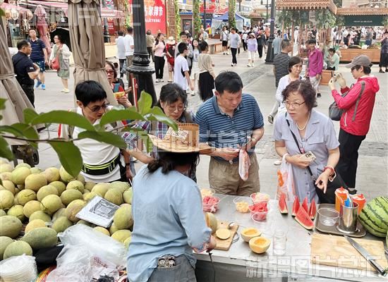 2023年6月28日,游客在新疆国际大巴扎景区品尝瓜果。