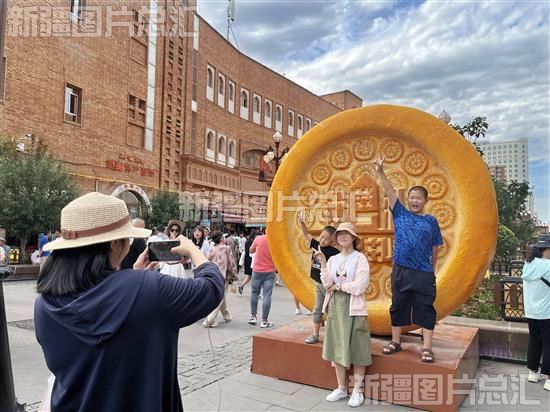 2023年6月28日,游客在新疆国际大巴扎景区拍照留念。