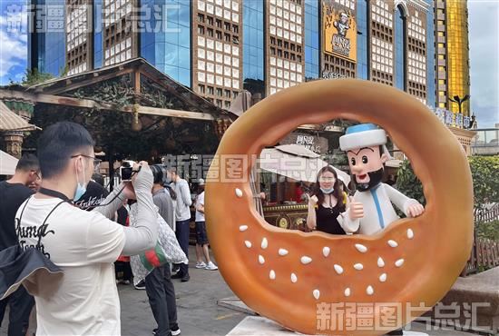 2023年6月28日,游客在新疆国际大巴扎景区拍照留念。