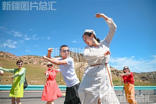 2023年6月28日,游客在天山百里丹霞景区跳舞。