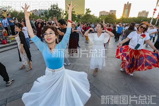 2023年7月3日,市民在乌鲁木齐南湖市民广场跳起民族舞蹈。