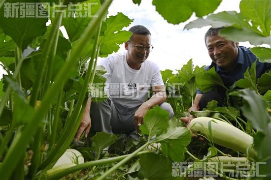 2023年7月4日,和布克赛尔蒙古自治县农业农村局驻夏孜盖乡谢仁托热村“访惠聚”工作队队员指导农户做好籽用葫芦田间管理。