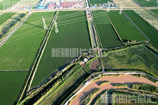 2023年7月1日,俯瞰新疆生产建设兵团第二师22团农田,呈现出一派生机勃勃的田园美景(无人机拍摄)。