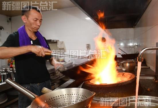 2023年7月6日,厨师在位于乌鲁木齐市米东区羊毛工镇新建村乡景农庄农家乐烹制美食。