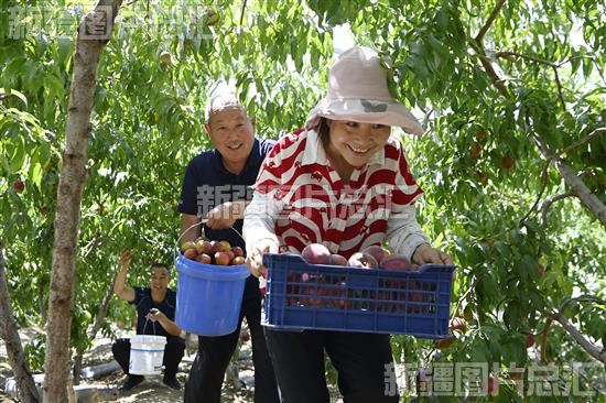 2023年7月7日,和布克赛尔蒙古自治县教育和科学技术局驻夏孜盖乡集中村“访惠聚”工作队队员帮助果农采摘油桃。