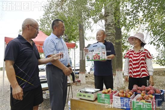 2023年7月7日,和布克赛尔蒙古自治县教育和科学技术局驻夏孜盖乡集中村“访惠聚”工作队队员帮果农销售油桃。