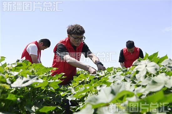 2023年7月7日,大学生志愿者在和布克赛尔蒙古自治县查和特乡一处棉田给棉花打顶。