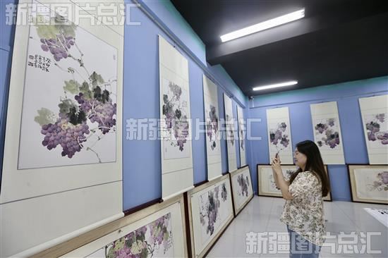 2023年7月9日,游客在吐鲁番市葡萄沟景区的裴雪峰艺术馆欣赏葡萄主题的绘画作品。