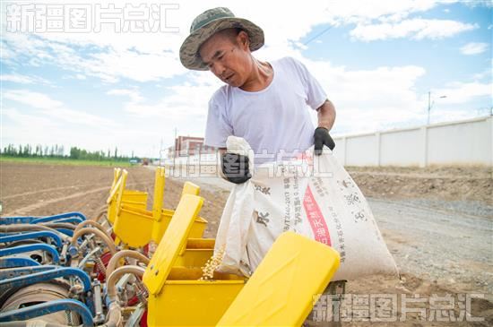 2023年7月10日,农户给播种机添加玉米种子。