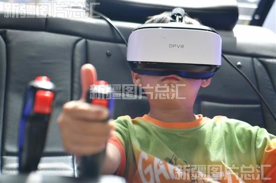 2023年7月13日,小朋友在乌鲁木齐市长春路一家VR体验馆模拟驾驶飞行器。