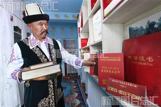2023年7月9日,乌恰县《玛纳斯》传承人江努日·图日干巴依在家中整理多年来获得的荣誉和获奖证书。