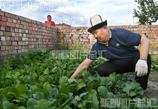 2023年7月9日,乌恰县《玛纳斯》传承人江努日·图日干巴依在家中小院里种植蔬菜。