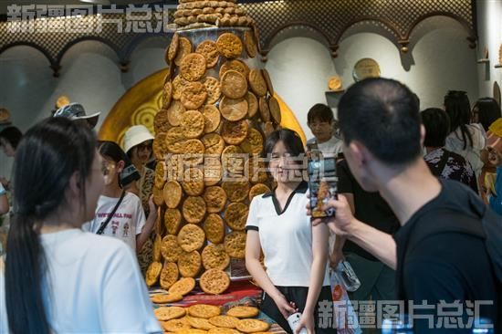 2023年7月22日,游客在新疆国际大巴扎景区馕文化园游玩拍照。