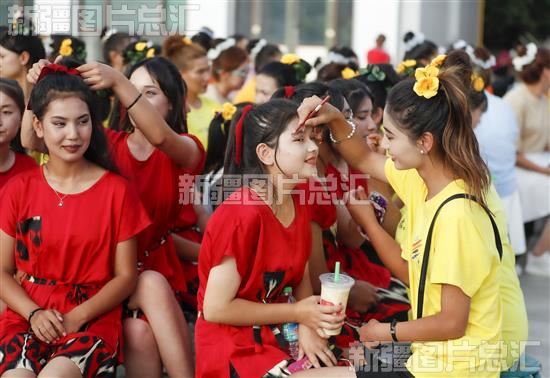 2023年7月18日,在洛浦县昆冈夜市,来自多鲁镇广场舞代表队的队员们在参赛前互相化妆。
