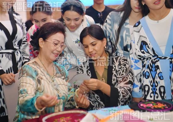 2023年7月29日,乌兹别克斯坦国家大剧院Tumor歌舞团演员向非遗传承人学习刺绣技艺。