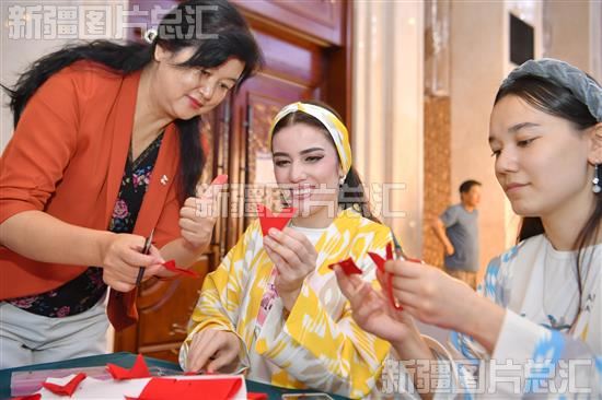 2023年7月29日,乌兹别克斯坦国家大剧院Tumor歌舞团演员向非遗传承人学习剪纸技艺。